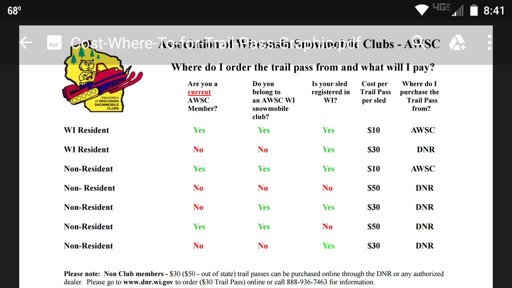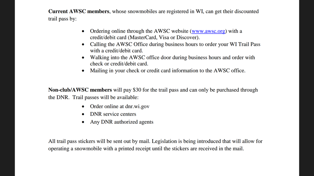 Sure has been a lot of confusion over this but just in the nick of time my copy of the Wisconsin Snowmobiler came in the mail. It's the magazine that's put out by the AWSC, Association of Wisconsin Snowmobile Clubs and the following picture details where to get your Trail Pass and how much it will cost.